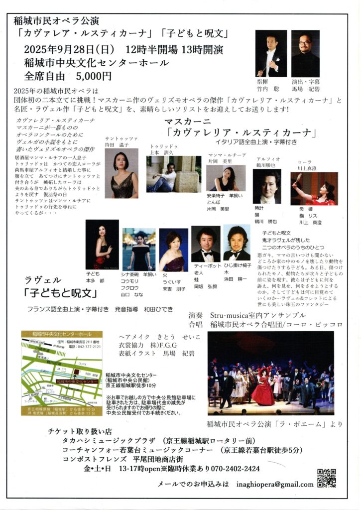 稲城市民オペラ公演「マスカーニ カヴァレリア・ルスティカーナ ラヴェル子どもと呪文」の指揮を担当させていただきます。